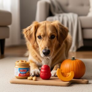 I fill a KONG with peanut butter (xylitol-free), pumpkin puree, or mashed banana, then freeze it.