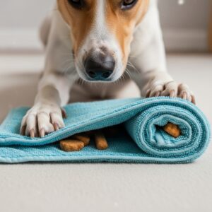 My dog has to sniff, paw, and unroll the towel to find the treats.