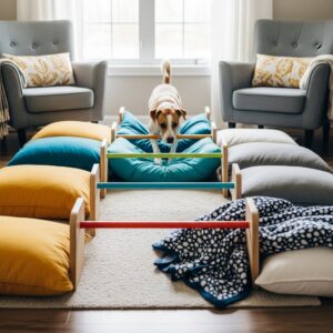 I use pillows, chairs, blankets, and boxes to make tunnels, jumps, and weave paths.