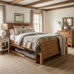 A farmhouse-style bed pairs beautifully with a wooden dog crate placed underneath.