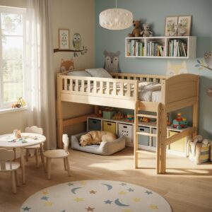 A low-height loft bed creates generous space underneath, ideal for a dedicated dog lounge.