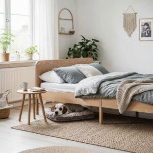 Scandinavian design emphasizes simplicity and comfort, making it a great match for a dog bed underneath. Light wood tones and neutral fabrics create a calm, cohesive look.