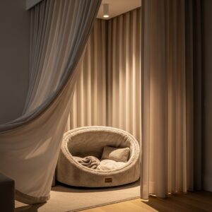 Adding lightweight curtains or fabric panels around a dog bed creates a cozy, enclosed feel.