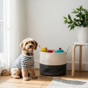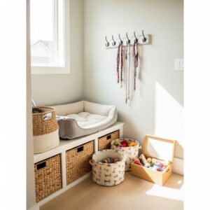 Use baskets or a small shelf to store toys, leashes, grooming tools, or blankets.