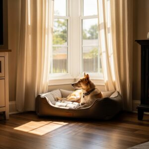 Place a cushioned bed where your dog can enjoy sunlight and outdoor views.