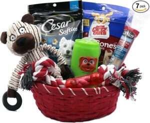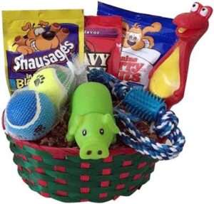 The basket includes 2 dog chewing toys, 4 assorted dog treats, and the basket itself.