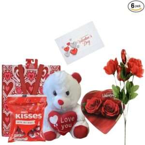 This complete Valentine’s Day gift set is beautifully curated, featuring a 9-inch teddy bear available in white or red, along with Hershey’s Kisses milk chocolate and Elmer heart-shaped chocolate.