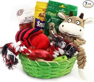 The basket includes 3 dog chewing toys, 2 assorted dog treats, 1 rope, and the basket itself.