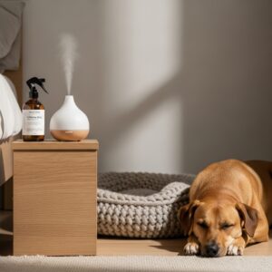 Using dog-safe calming sprays, pheromone diffusers, or lightly scented bedding can help reduce stress.